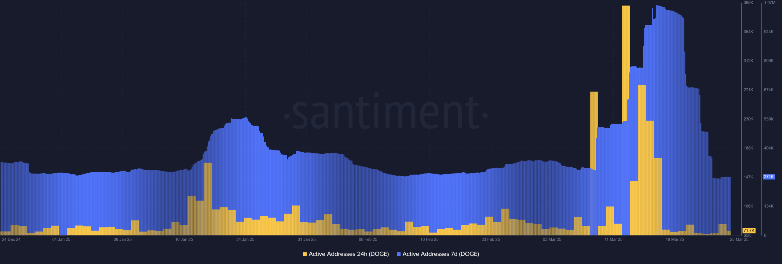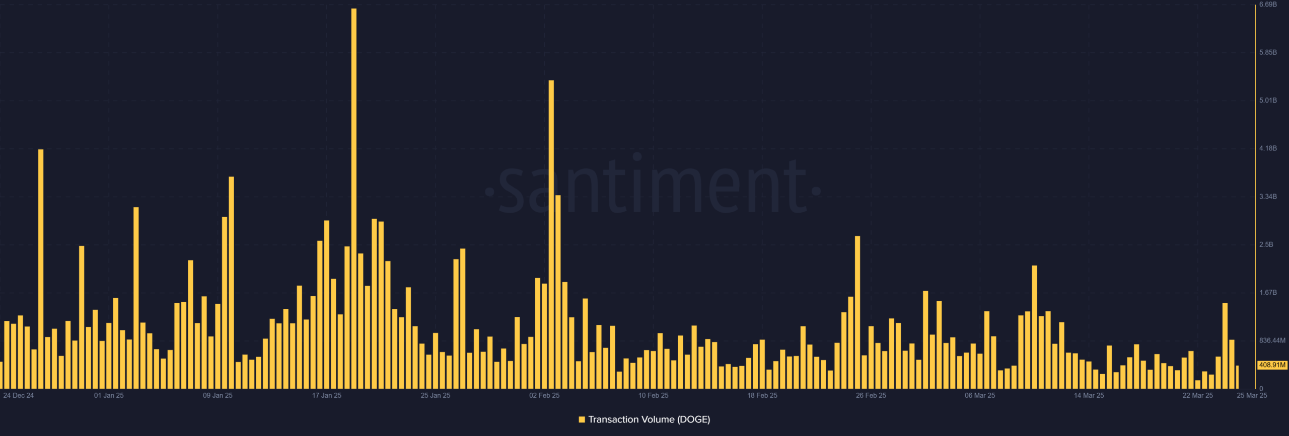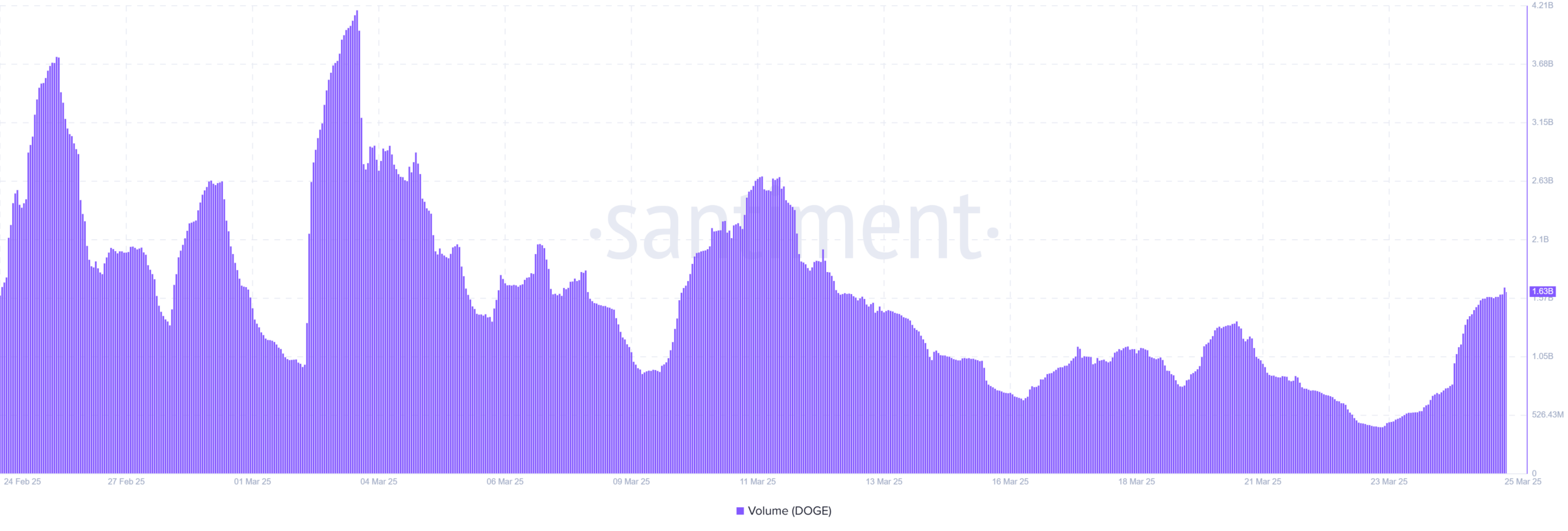 On 25 March, total on-chain transaction volumes rose to 858.59 million DOGE, up from roughly 354 million DOGE the day before.