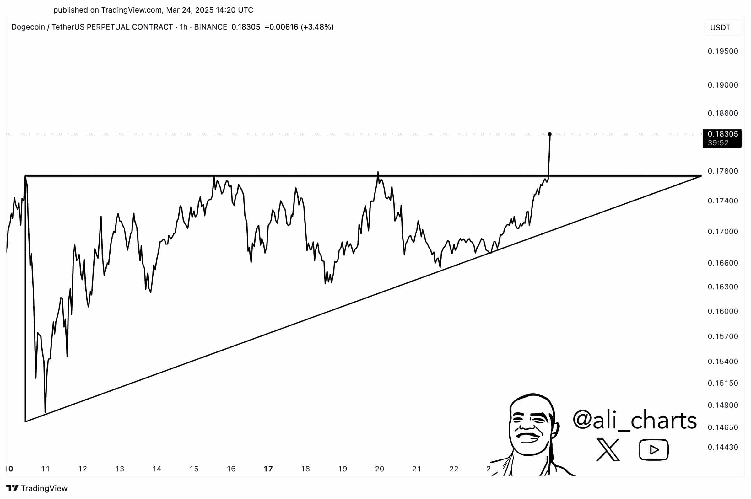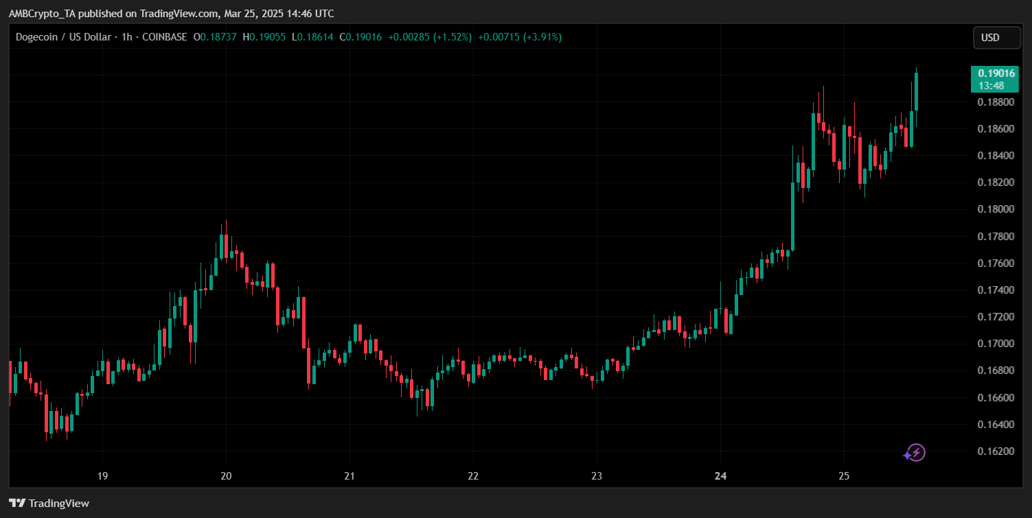 Between 24-25 March, DOGE surged from $0.176 to a session high of approximately $0.19158 – Representing gains of more than 8.8%.