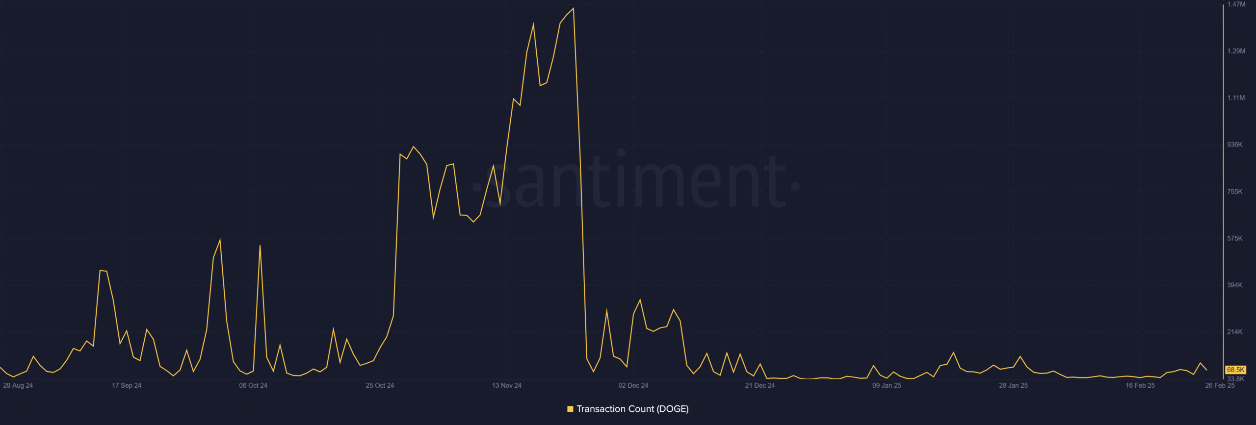 Transaction count data painted a similar picture, with DOGE showing consistent declines in daily transactions since its peak activity in late 2024.