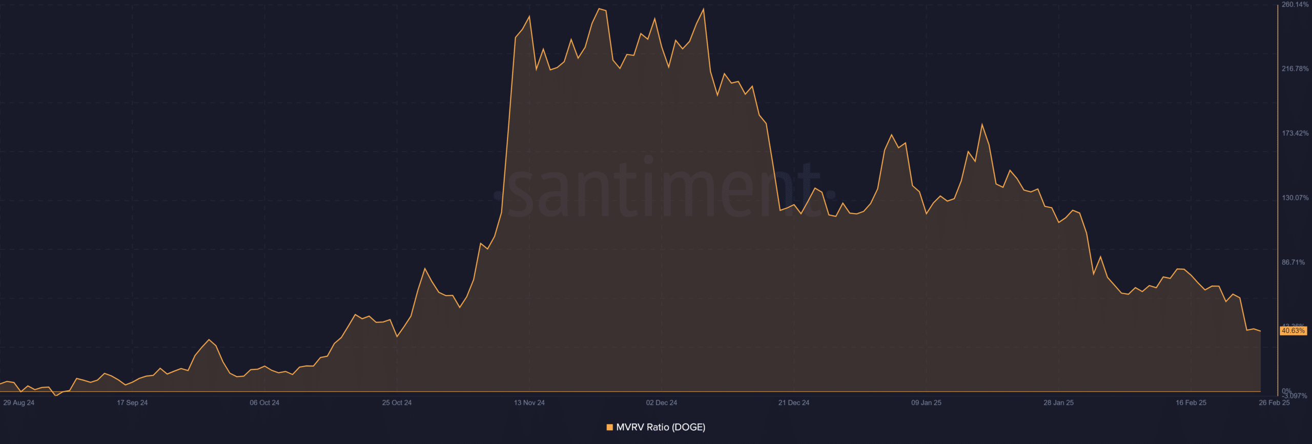 Dogecoin’s MVRV Ratio decreased to 40.63%, indicating a moderate decline from its previous highs.