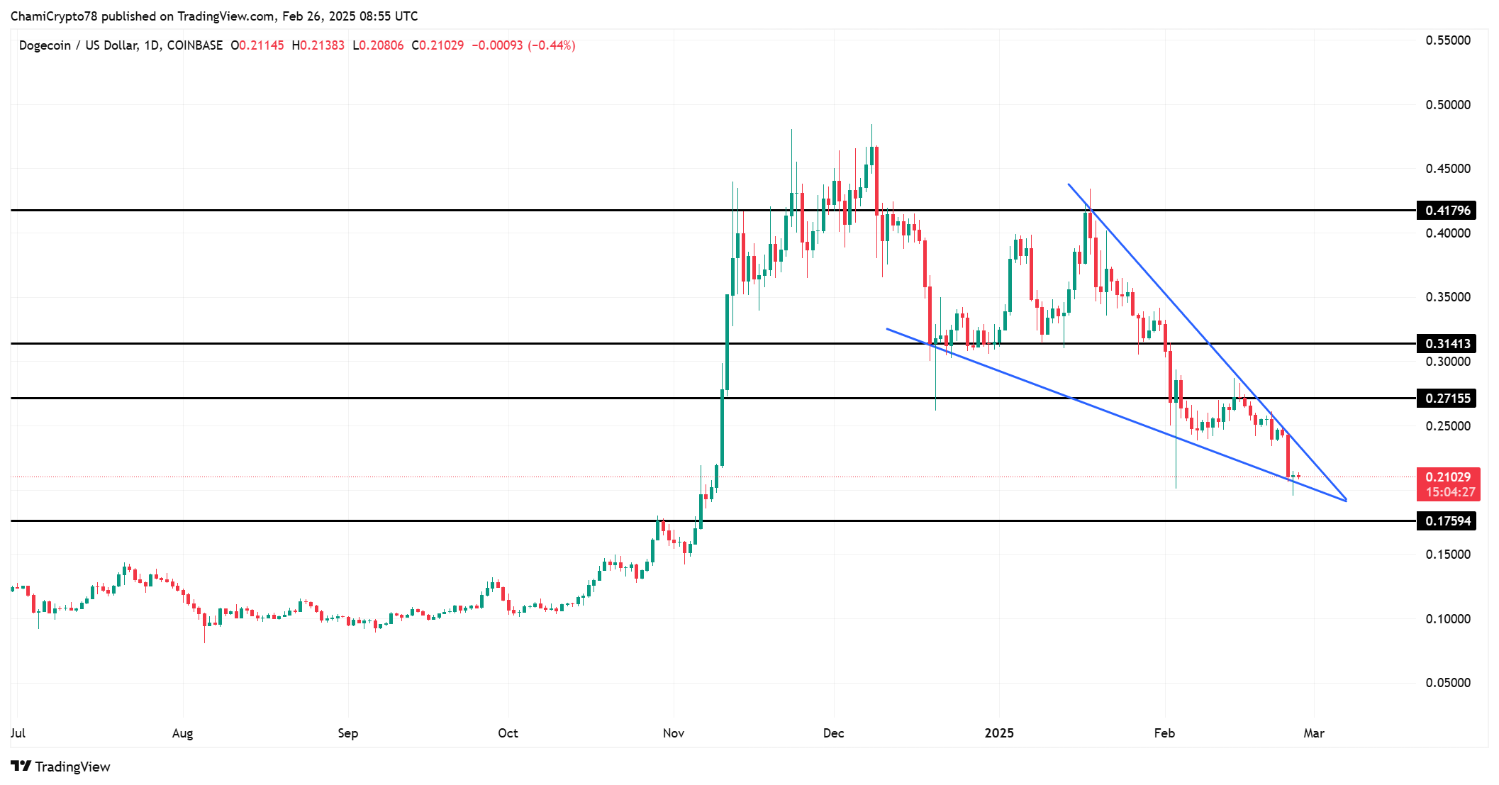 Without a substantial shift in its fundamentals or a strong market catalyst, Dogecoin is at risk of further declines. At this moment, the chances for Dogecoin to regain its previous highs appear slim.