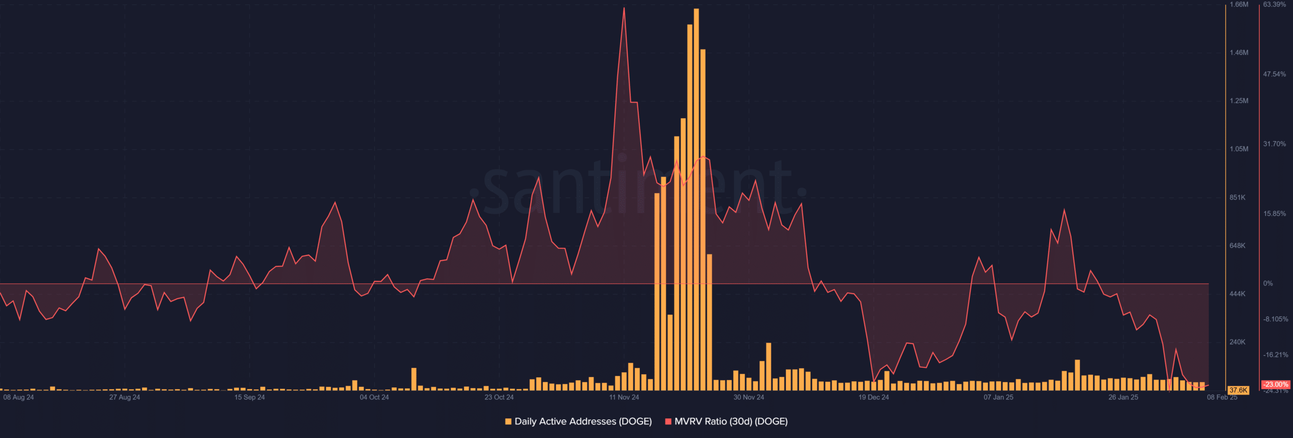 Dogecoin’s Daily Active Addresses plummeted to 37.6k too, a stark contrast to the 1.68 million peak seen during its November rally. This steep decline alluded to that fact that retail interest has been waning, reinforcing concerns that DOGE’s hype may be fading.