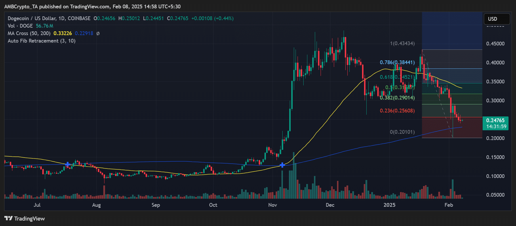 At the time of writing, DOGE was trading at $0.24765, following a significant drop from its December highs. The 50-day moving average sat at $0.33226, acting as a resistance level, while the price remained below the Fib 0.236 retracement level at $0.25608 – A sign of sustained bearish pressure.