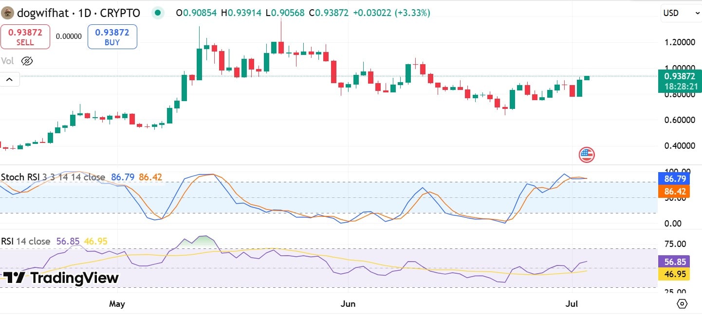 dogwifhat [WIF] soared 18.56% to hit a local high of $0.9558 before slightly retracing to $0.94 by the time of writing.