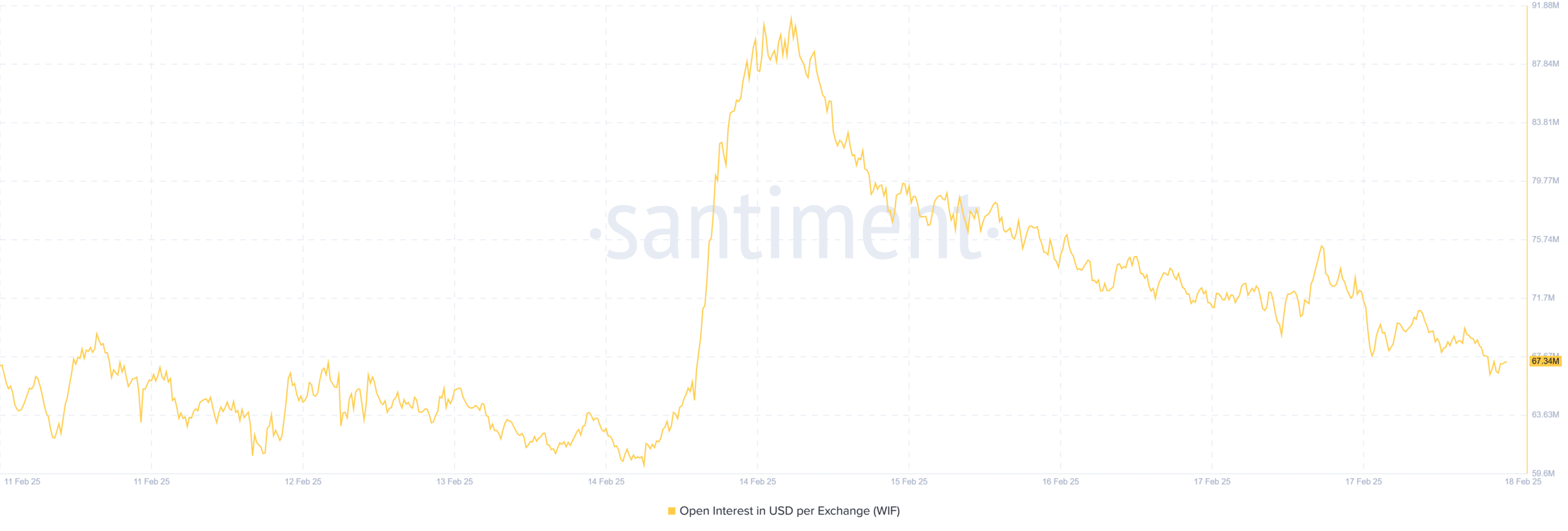 Additionally, dogwifhat’s Open Interest (OI) per exchange has dropped from $89 million to $67 million over the past week.