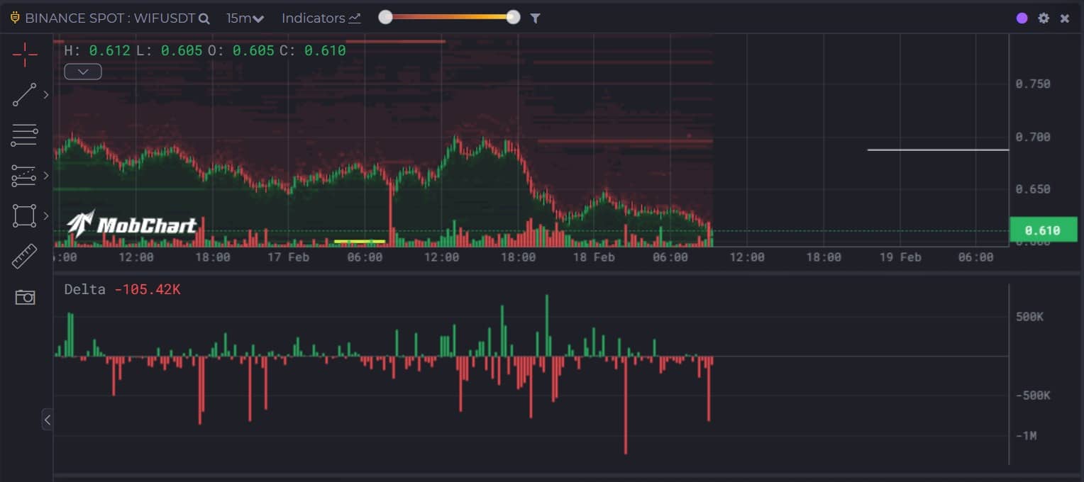 When the delta turns negative, it implies that selling pressure outweighs buying, signaling the possible continuation of this trend.