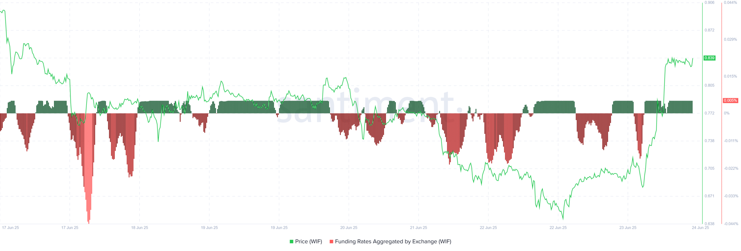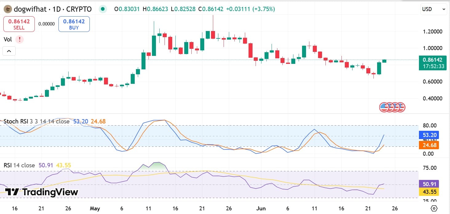 If momentum holds and buy-side interest sustains, WIF could revisit the $1 mark this week. That said, failure to break $0.86 cleanly could cause a pullback toward $0.79, its most recent support zone.