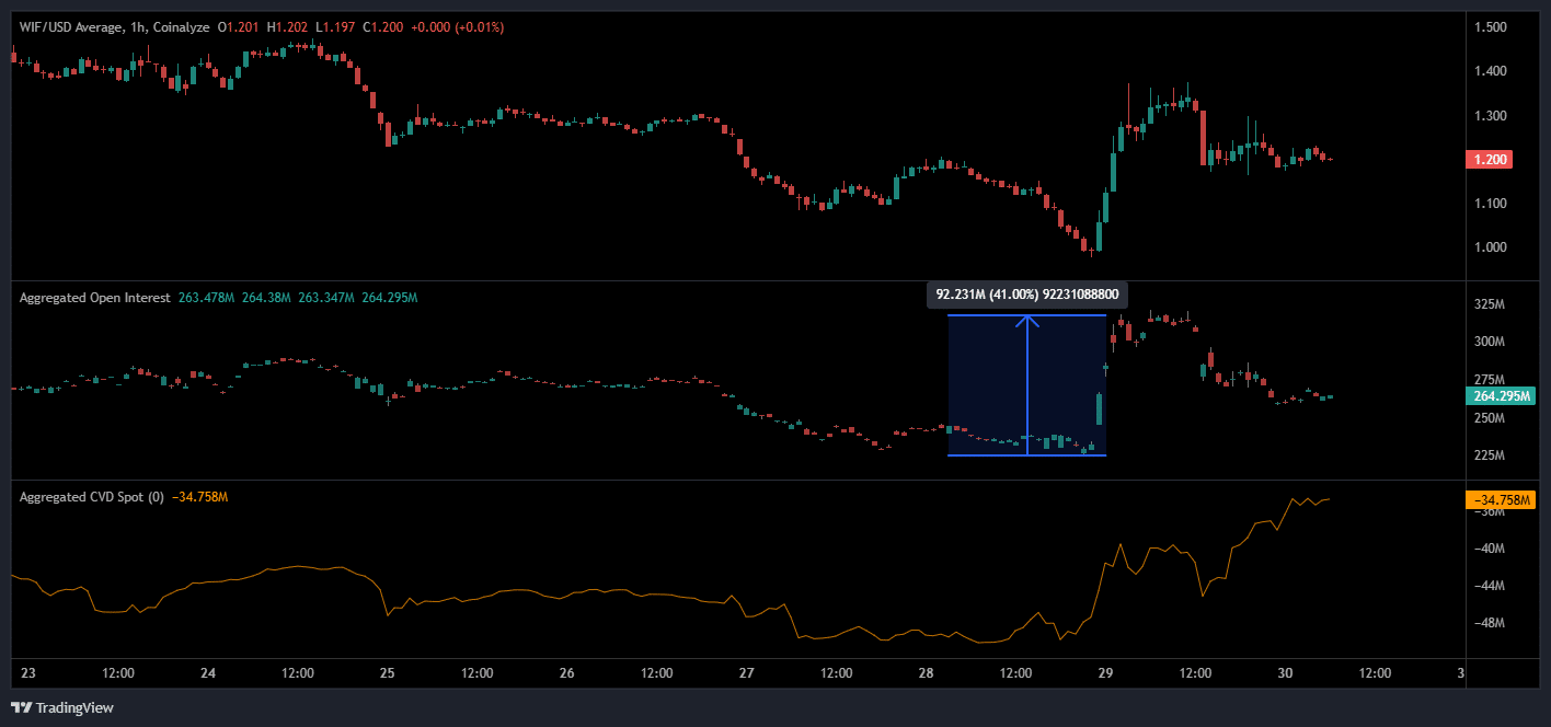 On the daily price chart, the OBV spiked, indicating substantial trading volume. WIF saw a massive $326M in daily trading volume on the 29th of February, much higher than the bid volumes seen in March 2024.
