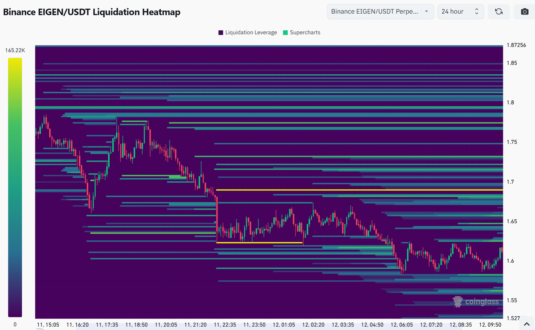 The liquidation heatmap for EIGEN revealed a critical point of interest at the $1.60 price range, where there is significant leverage.