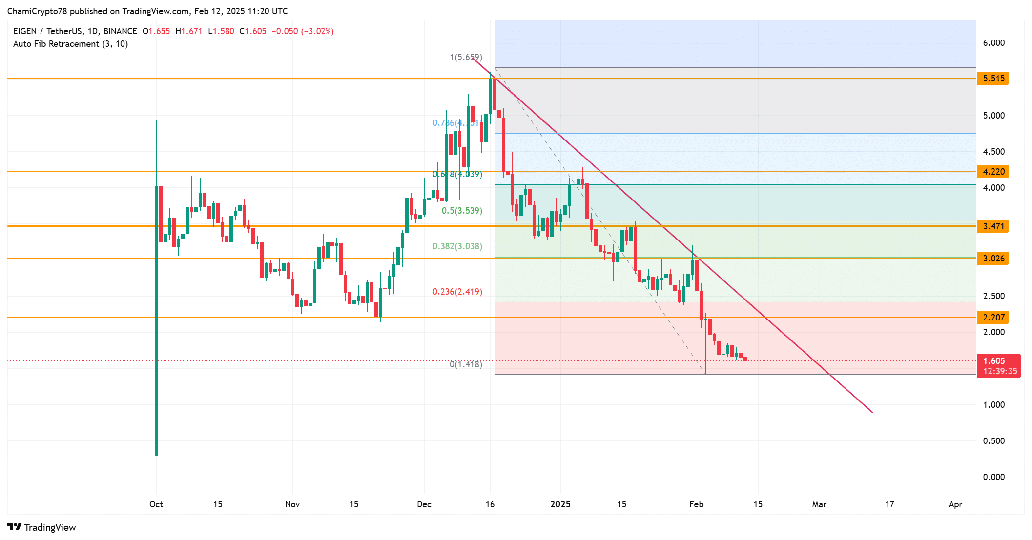 At press time, EIGEN was trading at $1.61, showing a sharp 9.77% decrease within the last 24 hours. The price has seen a steady decline from the peak of $5.659, and it’s now below critical resistance levels.