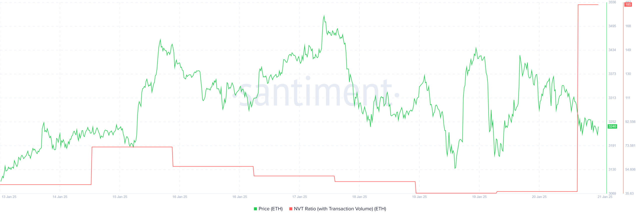 This drop in addresses is further evidenced by a rising NVT ratio, which has spiked to 185.5, signaling reduced transaction activity. As such, transactions on the Ethereum network have continually reduced.