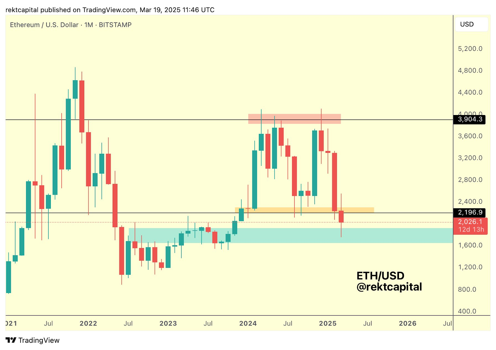 To stage a reversal from thncoinglis downtrend, Ether price needs to reclaim the “macro range” above $2,200, wrote popular crypto analyst Rekt Capital in a March 19 X post: