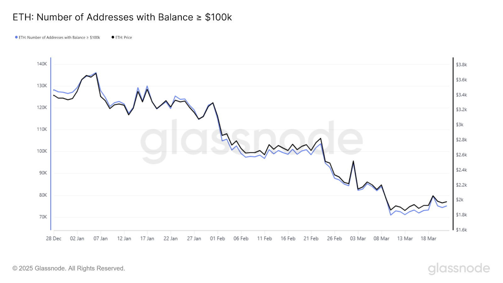 The number of addresses with at least $100,000 worth of Ether started rising at the beginning of March, from just over 70,000 addresses on March 10 to over 75,000 on March 22, Glassnode data shows.