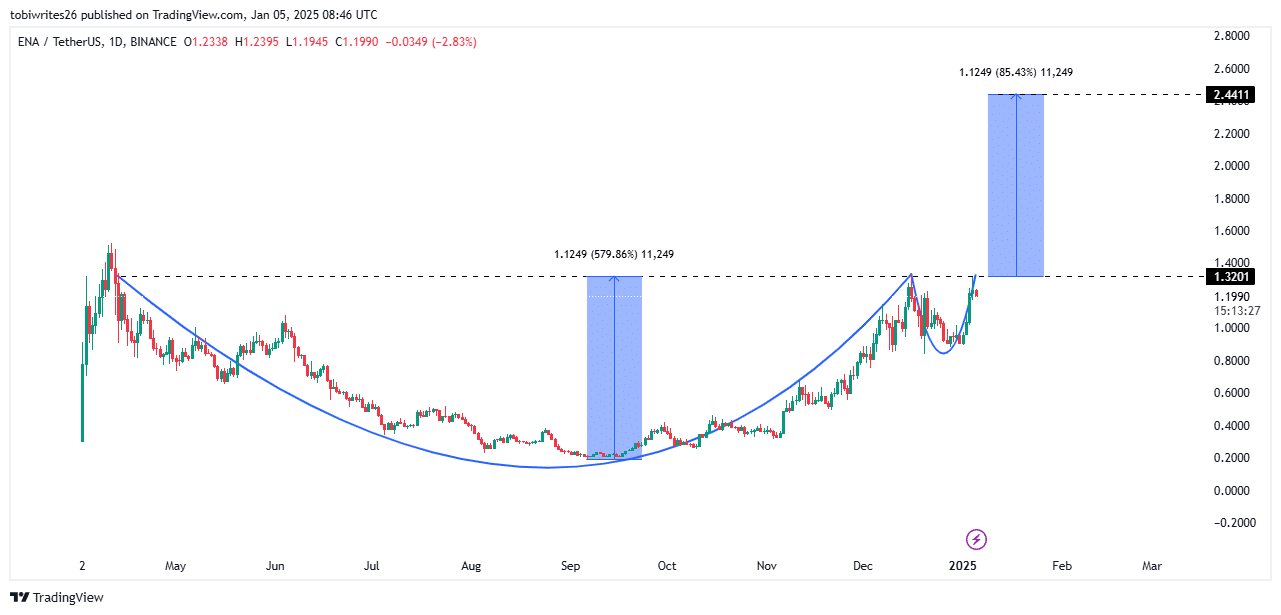 On the chart, ENA was trading within a cup and handle pattern at press time, a classic bullish formation that often precedes a rally.