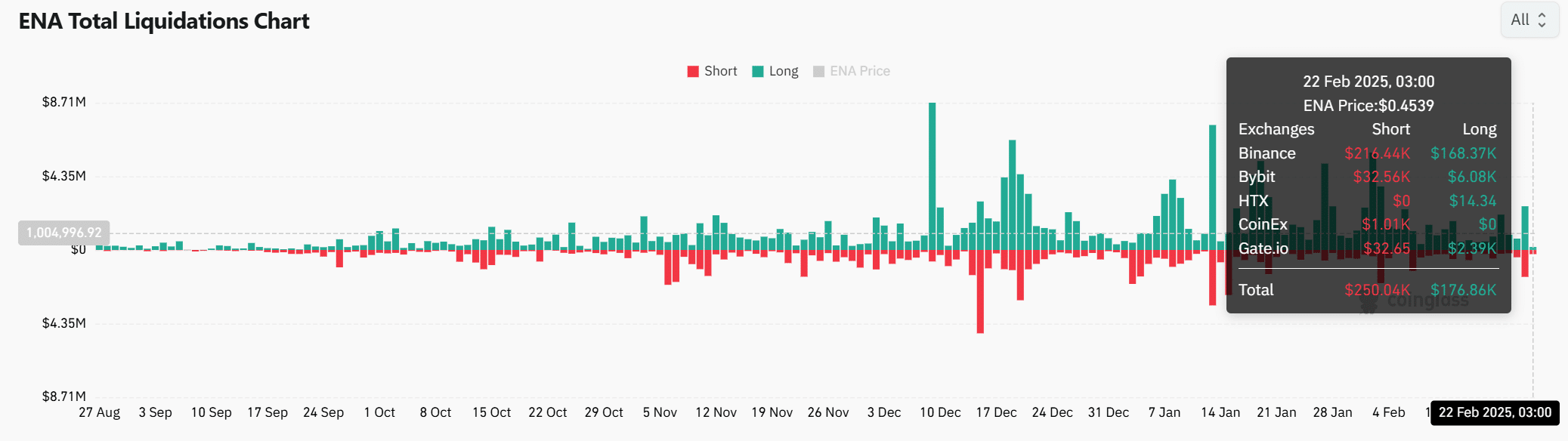Interestingly, on the 22nd of February, total liquidations amounted to $250.04K in short positions and $176.86K in long positions.