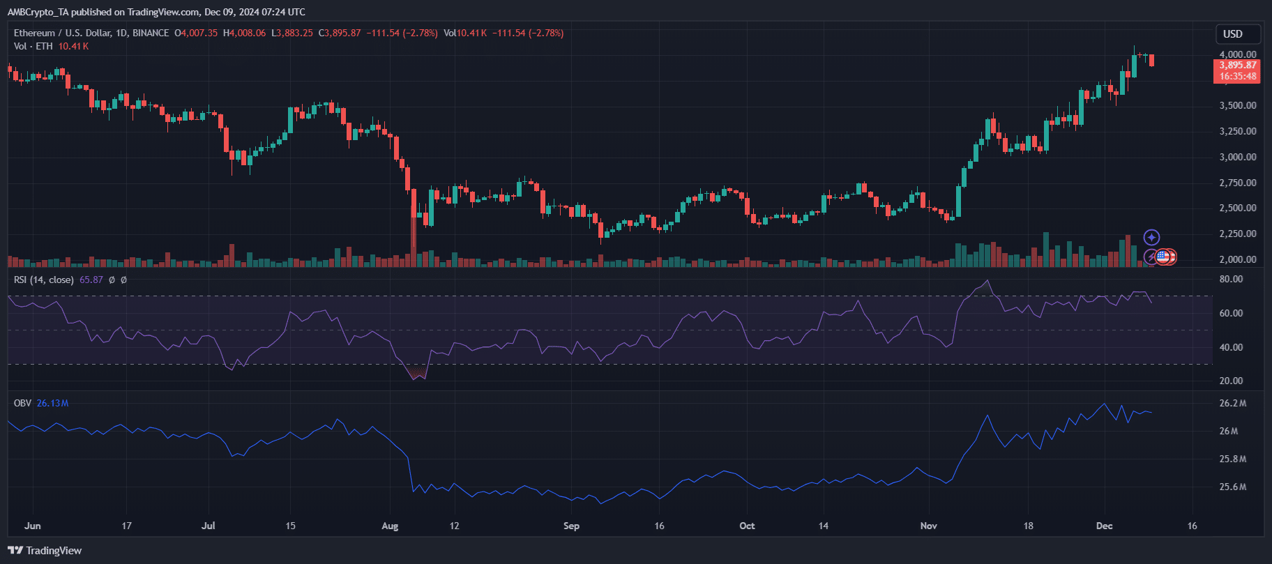 - Breaking $4,100 resistance could propel ETH towards its all-time high of $4,891.
