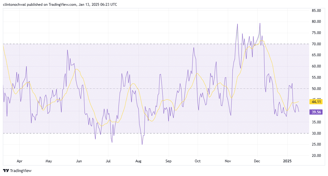 Conversely, a rise in RSI above 50 could signal renewed bullish momentum, complementing a potential breakout from the descending triangle pattern.