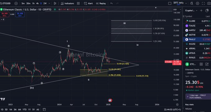 In the Fibonacci retracement levels, Ethereum Classic’s price recently hovered near the 0.618 retracement level at $23.46, a zone historically regarded as strong support.