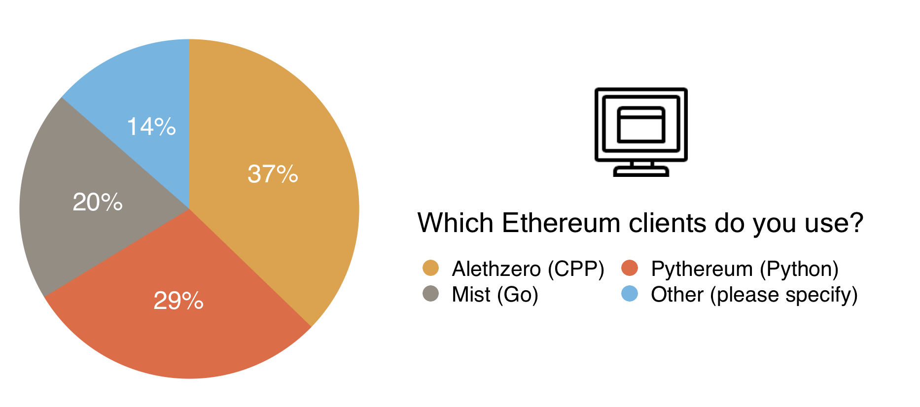 Thanks to Alex Van de Sande for helping with the implementation of the survey and chart graphics. Icons retrieved from icons8. If anyone would like a copy of the raw survey results, feel free to email george@ethdev.com.