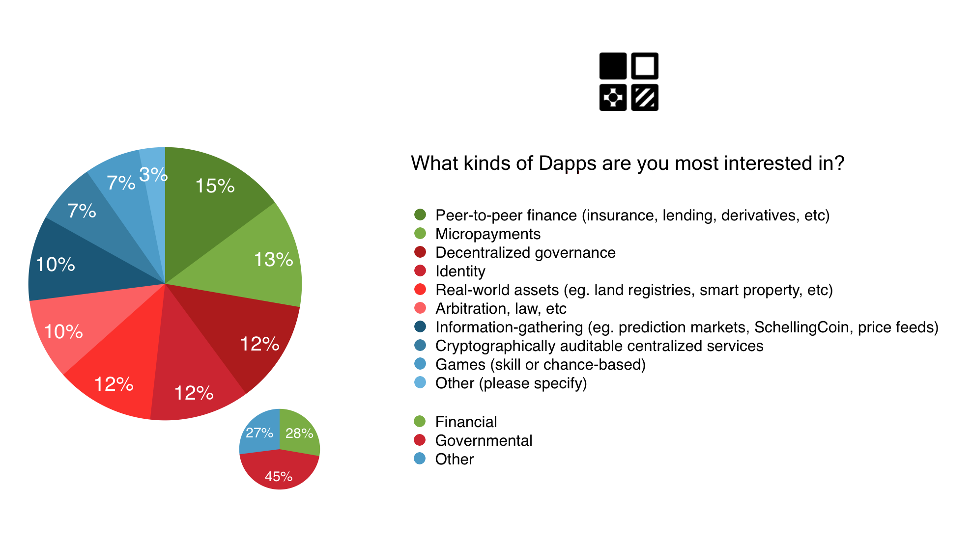 It’s interesting to see a very mixed bag of responses for this question. As was said previously, Ethereum’s use cases are as wide as they are varied, and it’s great to see how many different types of services people are looking to implement on top of Ethereum. The emphasis on governance based Ðapps highlights Ethereum’s ability to facilitate interactions between the digital and physical world and create autonomously governed communities that can compete with both governments and corporations. Primavera De Filippi and Raffaele Mauro investigate this further in the Internet Policy Review Journal.