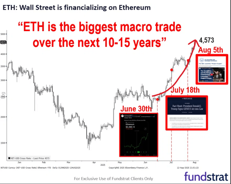 According to Fundstrat research, Ether could climb much higher before the end of 2025, with price targets ranging from $10,000 to as high as $15,000.