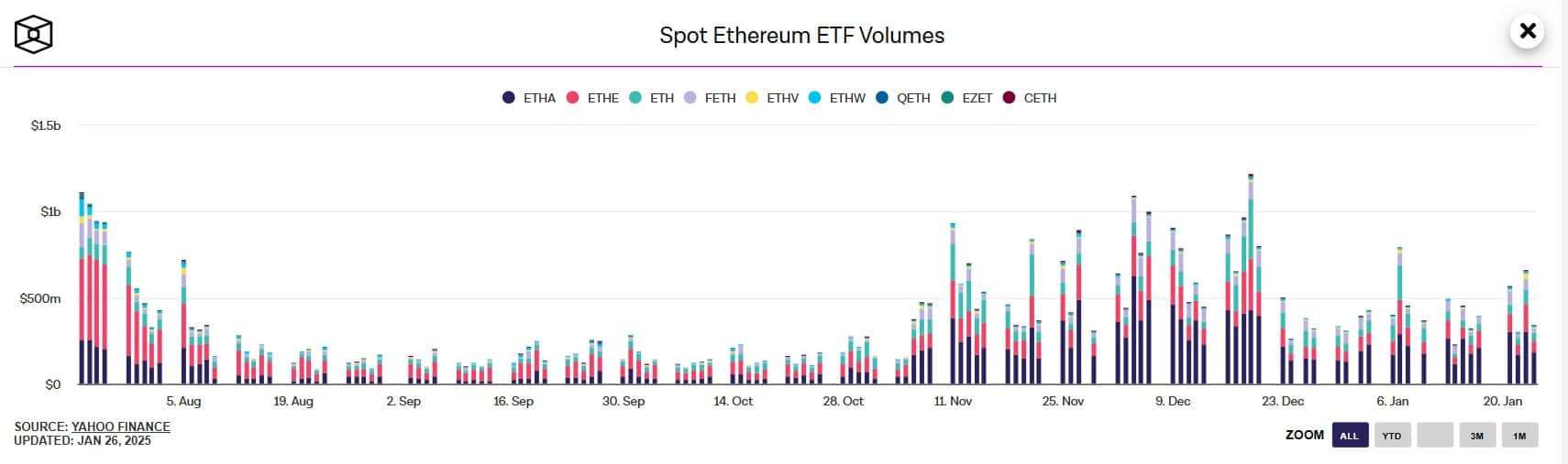 ETH ETFs have experienced impressive growth, with trading volumes increasing steadily since November 2024.