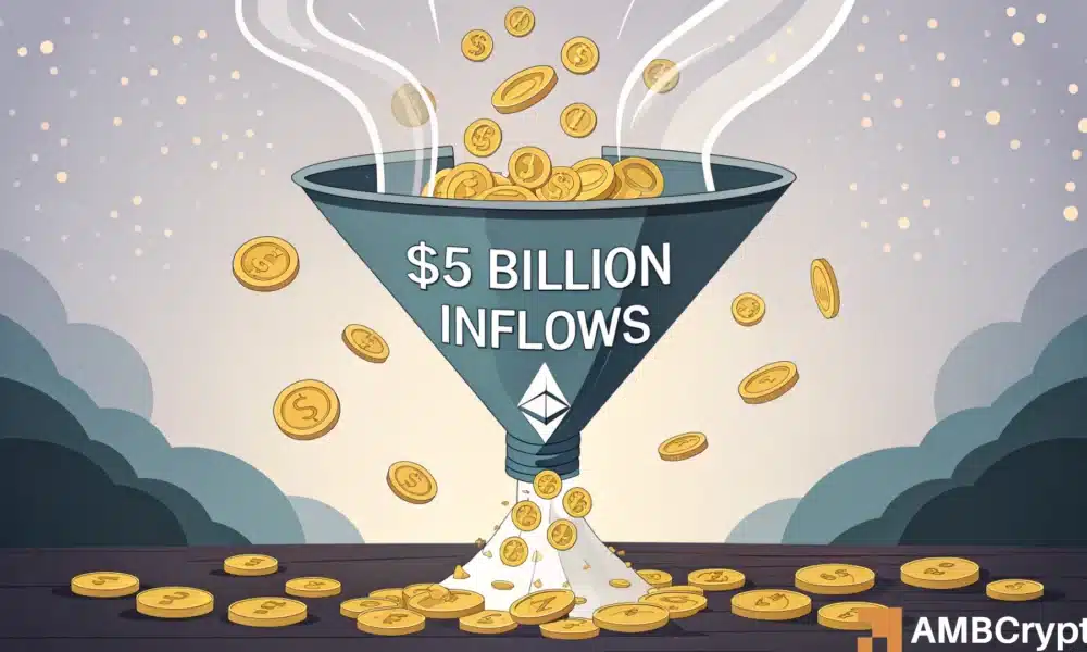 - Ethereum ETFs attract over $5 billion in inflows, signaling growing institutional confidence