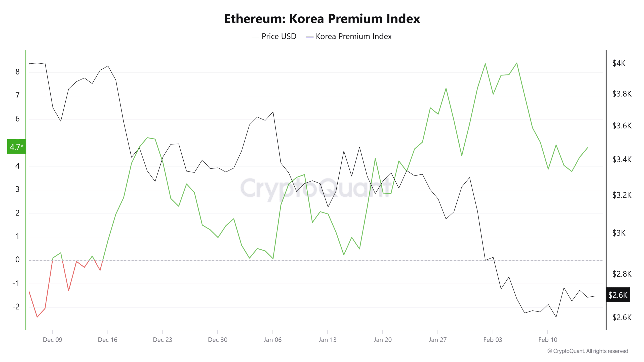 The Korea Premium Index measures buying and selling activity on Korean exchanges compared to other exchanges. A metric above zero indicates bullish sentiment, while below zero suggests bearish conditions.