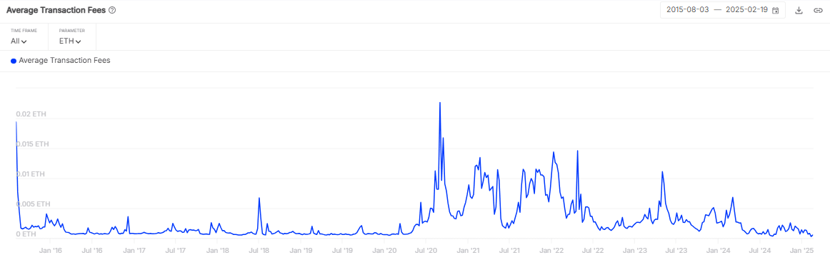 According to data from IntoTheBlock, the average gas price has plummeted to around 5 gwei, translating to roughly $0.80 per transaction — a sharp decline from the $20-plus fees seen during peak activity in 2024.