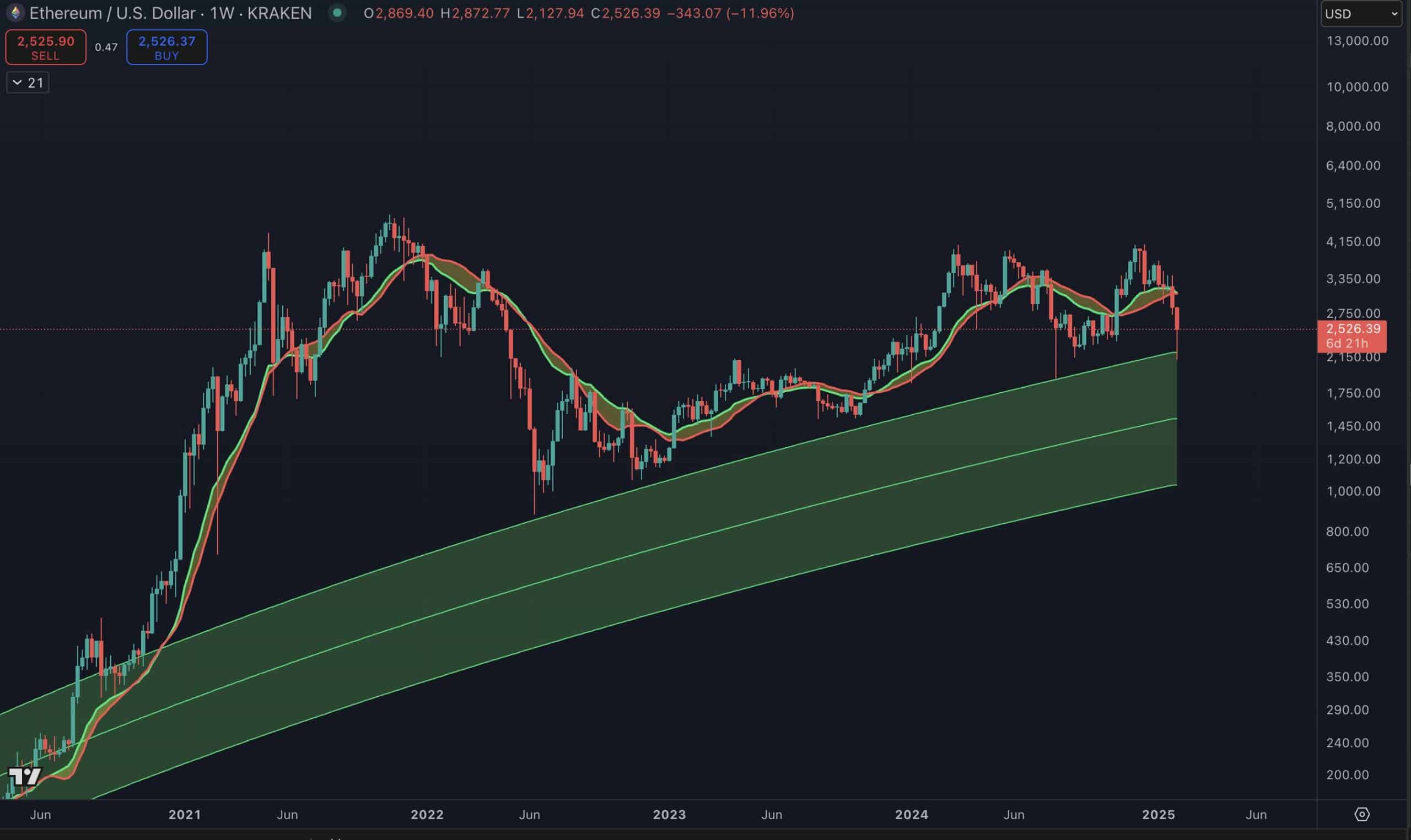 Historically, Ethereum moved above the midline of this channel during peak bull runs, as seen in late 2021 when it surged towards $4,000.