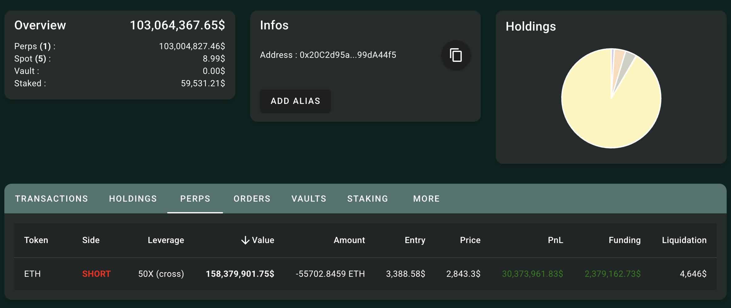 As the ETH price fell, a whale who shorted ETH using 50x leverage saw their unrealized profit soar past $30M. This aggressive short position likely intensified the downward pressure on ETH’s price.