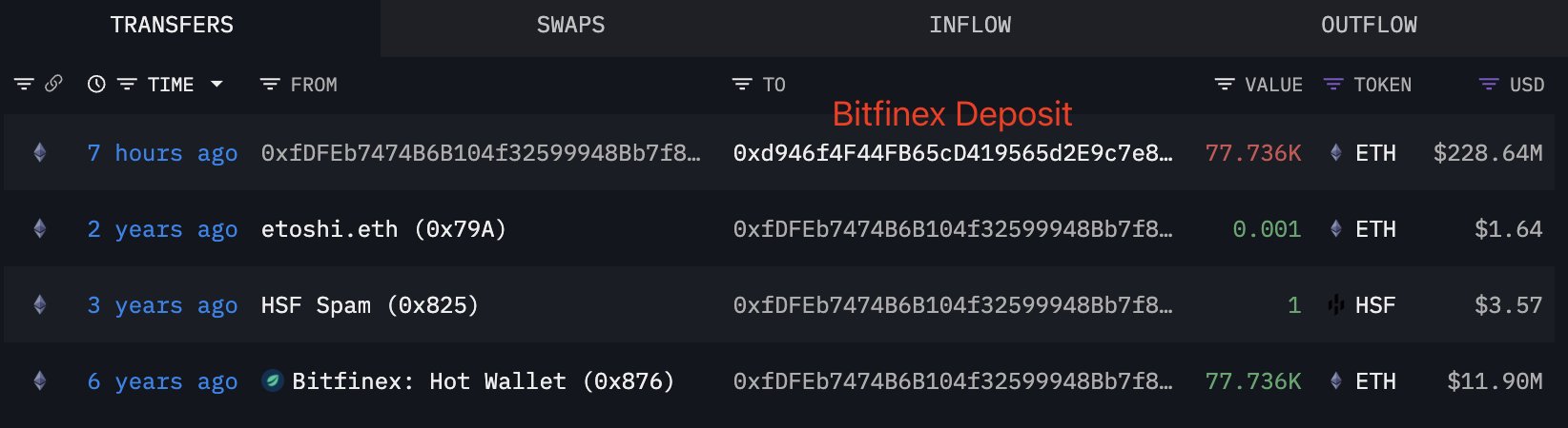A notable Ethereum whale, dormant for six years, transferred 77,736 ETH, valued at $228.6M, to Bitfinex. This wallet had initially withdrawn the same amount for just $11.9M in January 2019, when ETH was priced at $153 per token.