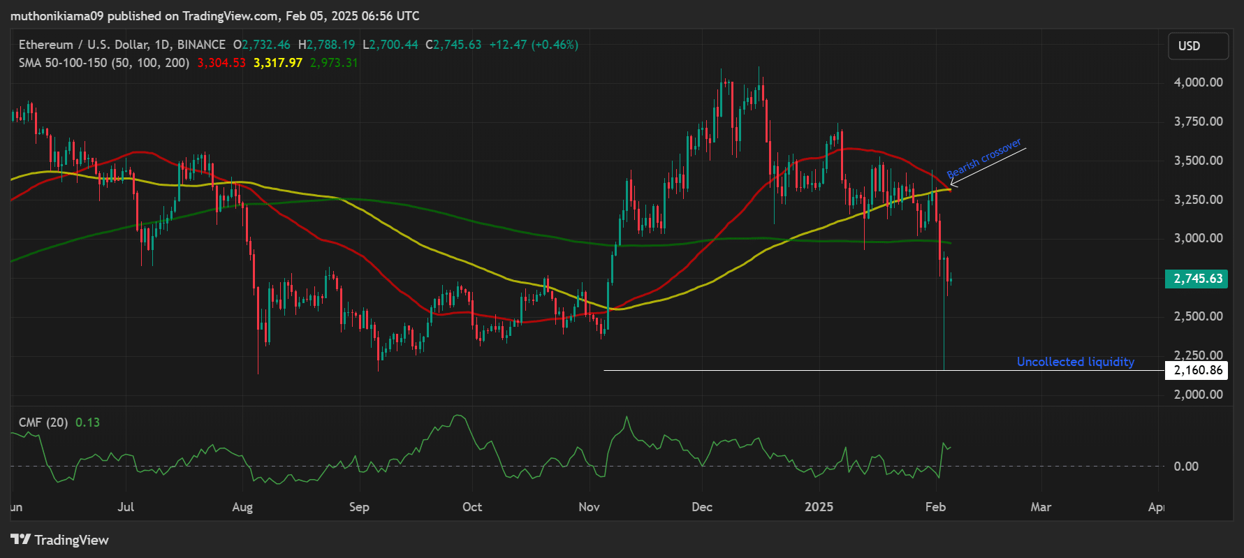 Ethereum had formed a bearish crossover on its one-day chart after the 50-day Simple Moving Average (SMA) crossed below the 100-day SMA.