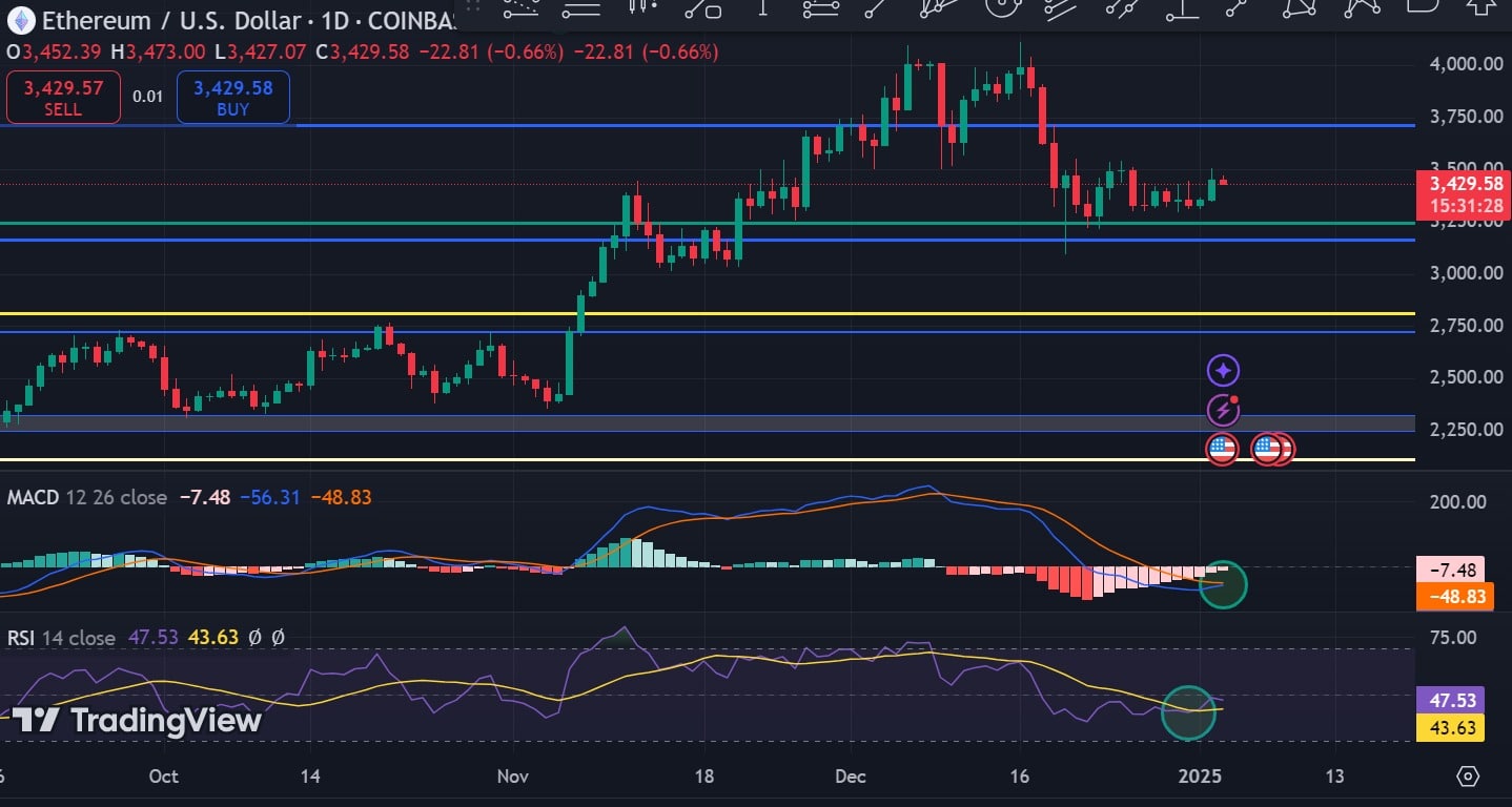 At the time of writing, ETH was trading at $3,429, marking a moderate increase of 0.21% on daily charts and an extension of this bullish trend by 2.45% on weekly charts.