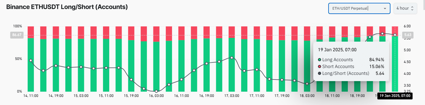 Finally, the long/short ratio revealed that 84.94% of accounts were long – A sign of strong bullish sentiment for Ethereum.