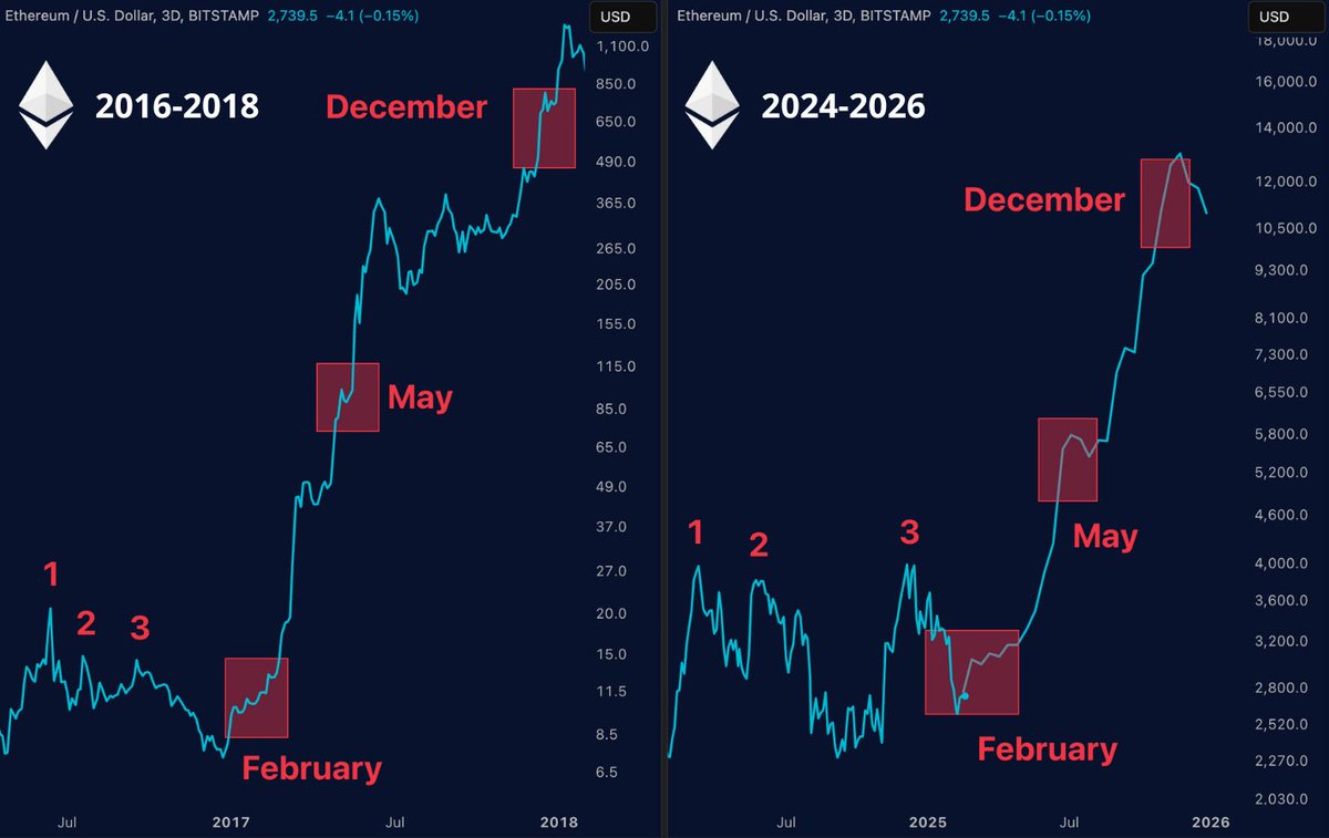 Ether’s over 32% monthly correction may signal that ETH price is setting up for the next leg up based on fractal patterns from the 2017 cycle shared by popular crypto trader Merlijn The Trader in a March 1 X post.