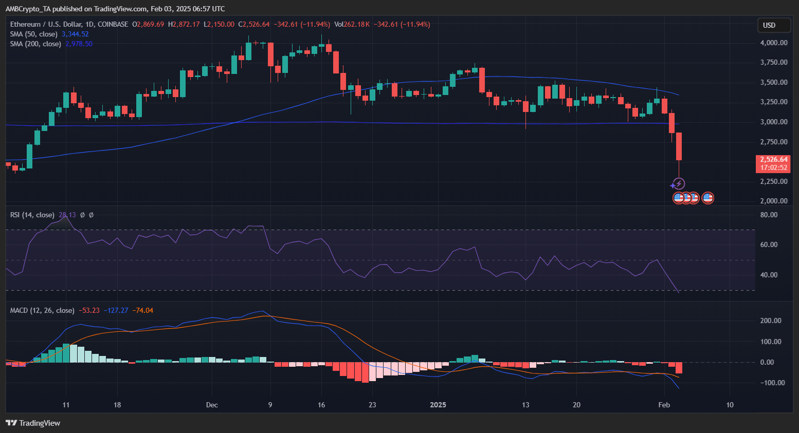 The decline accelerated as it slipped beneath key support levels at $2,800 and $2,650. This pushed it into a bearish zone and raised alarms among investors.