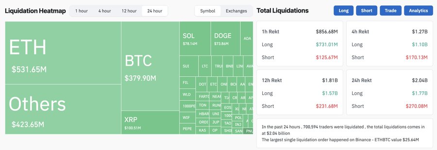 In the past 24 hours, $2.04 billion has been liquidated from the crypto market, with ETH alone accounting for $531 million of that total.
