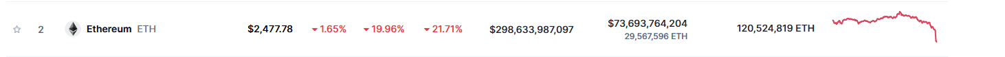 This downward pressure accelerated as ETH breached the $2,500 mark, dropping over 25% and reaching a low of $2,127, testing the $2,120 zone.