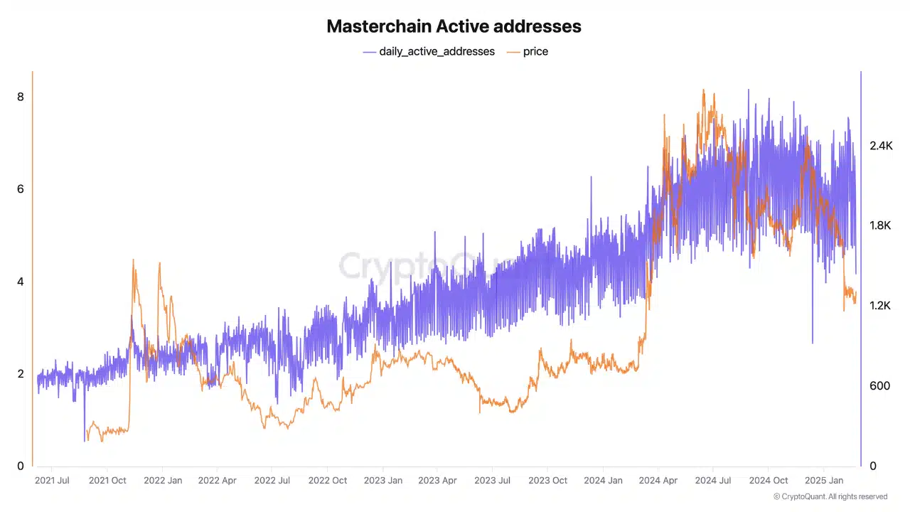 By February 2025, active addresses declined to 2 million, with the price stabilizing as well. Despite this fall, however, the network retained a higher baseline than in previous years, signaling persistent user activity.