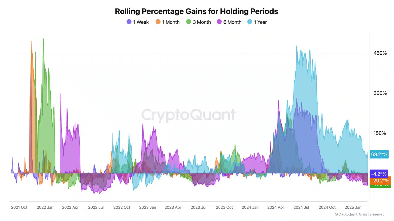 TON’s rolling percentage gains, measured from October 2021 to January 2025, revealed an advantage for long-term investors. Holders who maintained positions for over one year secured a 69% profit by early 2025, despite market volatility.