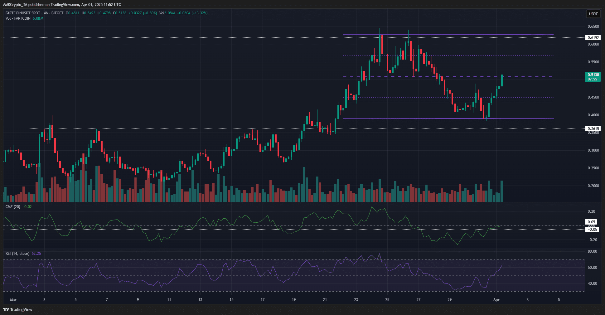 FARTCOIN has already surpassed the $0.3615 resistance and flipped it to support. This move was important and marked its bullish structure shift. The $0.619 level was likely to be flipped to support next.