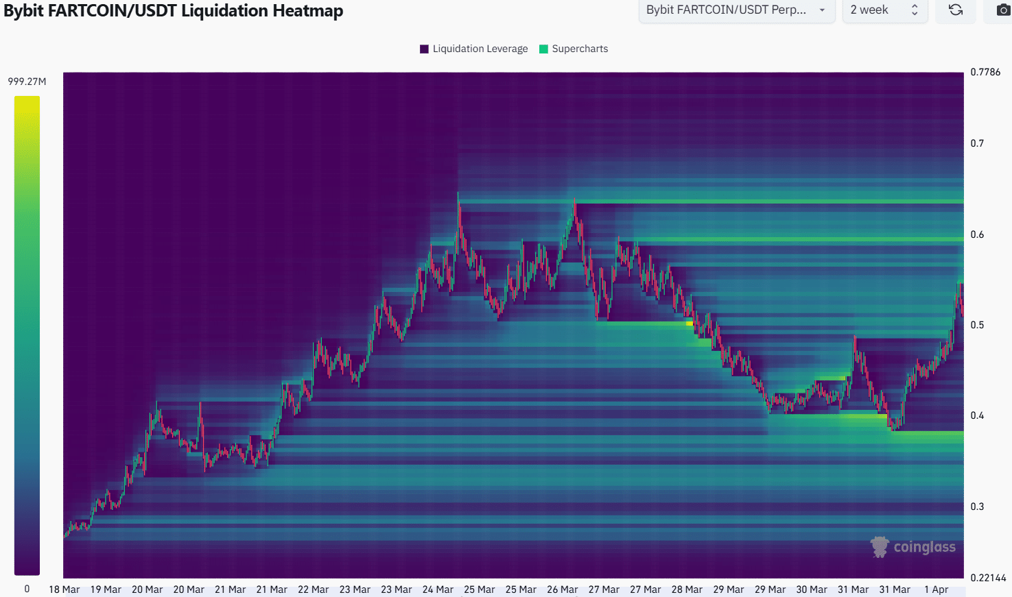 The Fartcoin liquidation heatmap showed that there was significant liquidity at $0.556, $0.6, and $0.64. The liquidity pocket below the price was far away and roughly the same size as the ones above.