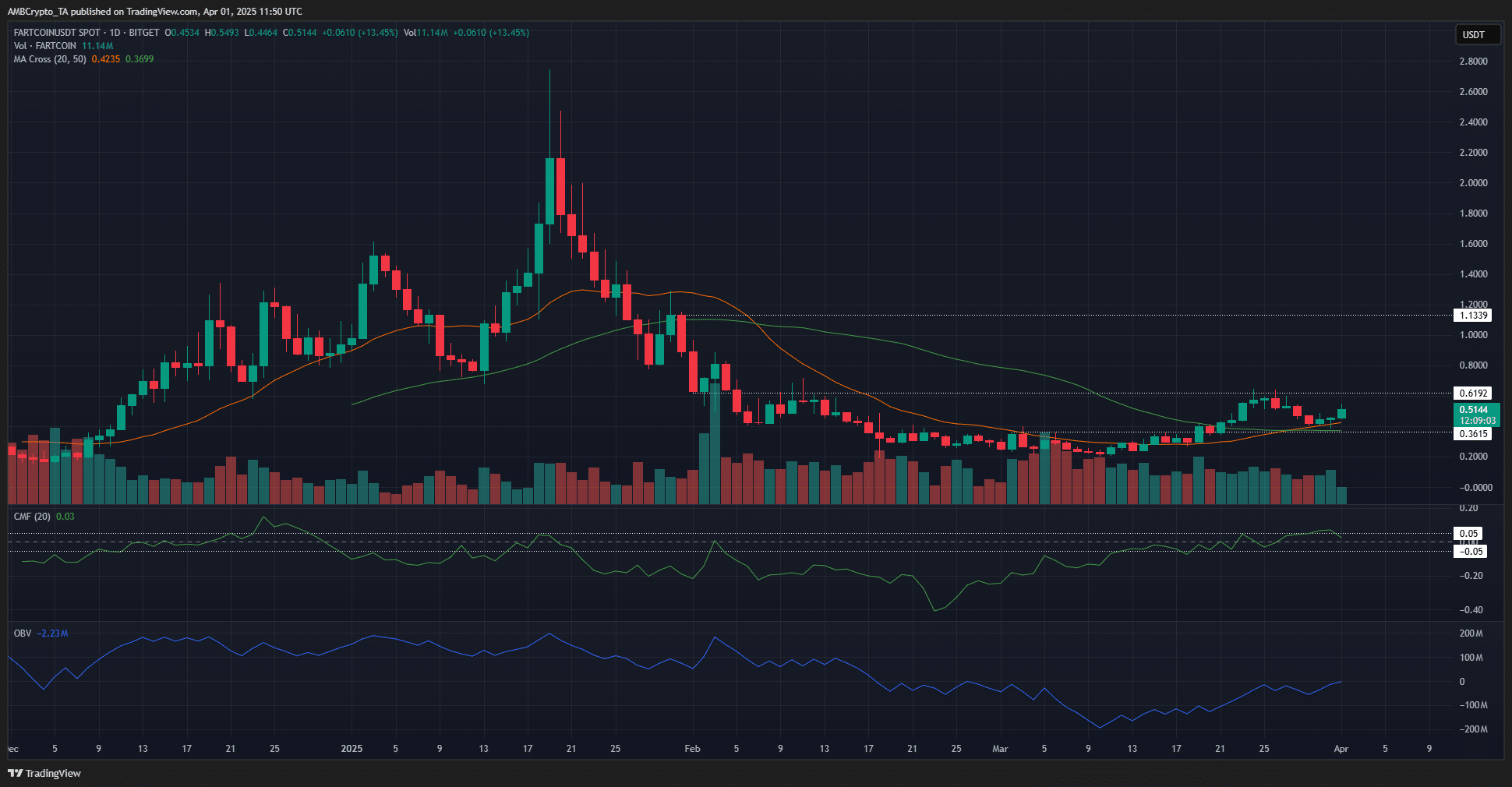 On the 1-day chart, Fartcoin appeared to be reversing its bearish trend. The 20 and 50-day moving averages formed a bullish crossover on the 28th of March.