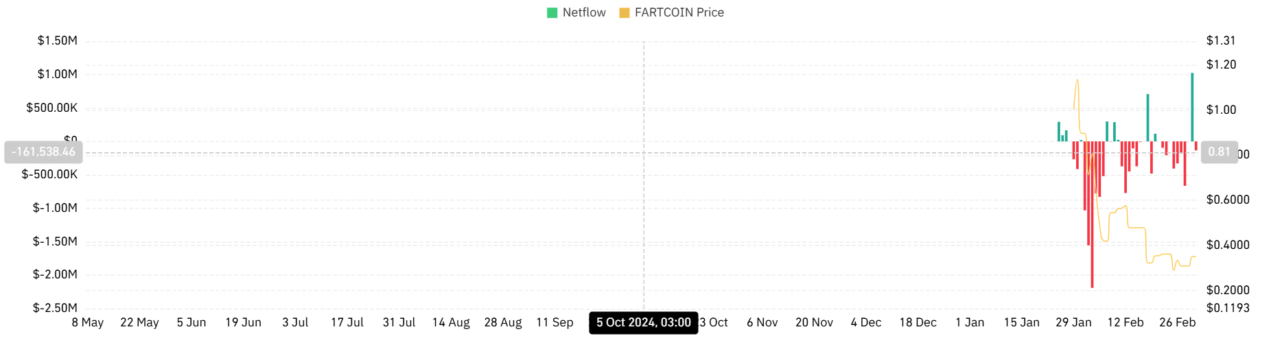 According to Coinglass, Fartcoin’s spot exchange turned negative, reaching -133.21k after previously spiking to $1.02 million.