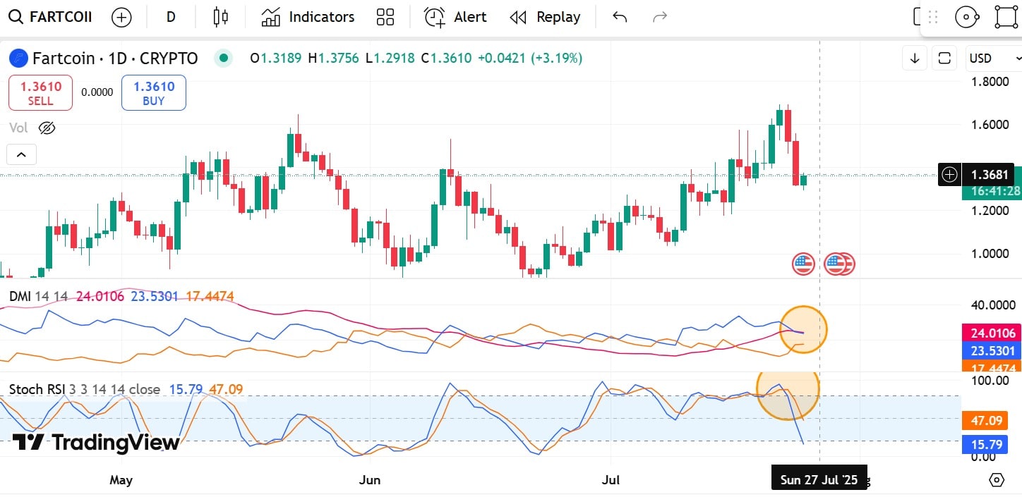 At the time of writing, Fartcoin was trading at $1.36, marking an 8.97% decline over the past day. This bearish outlook extends on weekly charts by 12.38%.