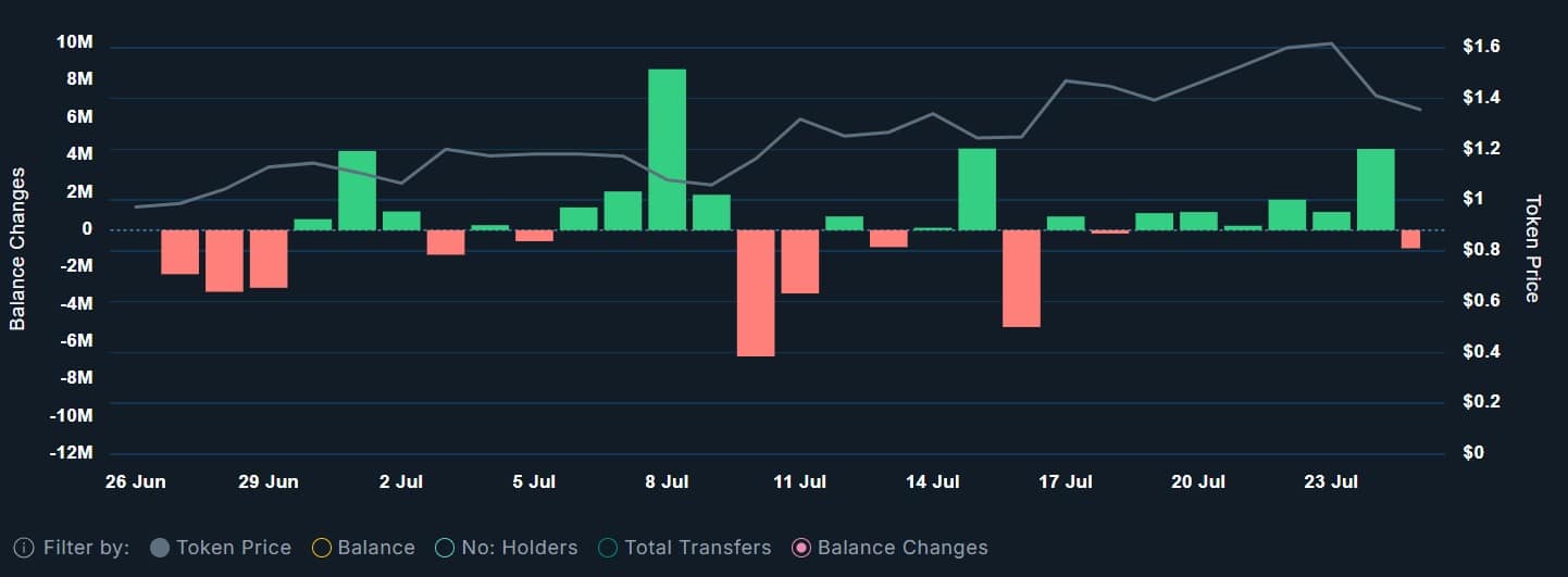 As of this writing, the whale balance was around -1.41 million tokens, a clear sign of aggressive whale selling.