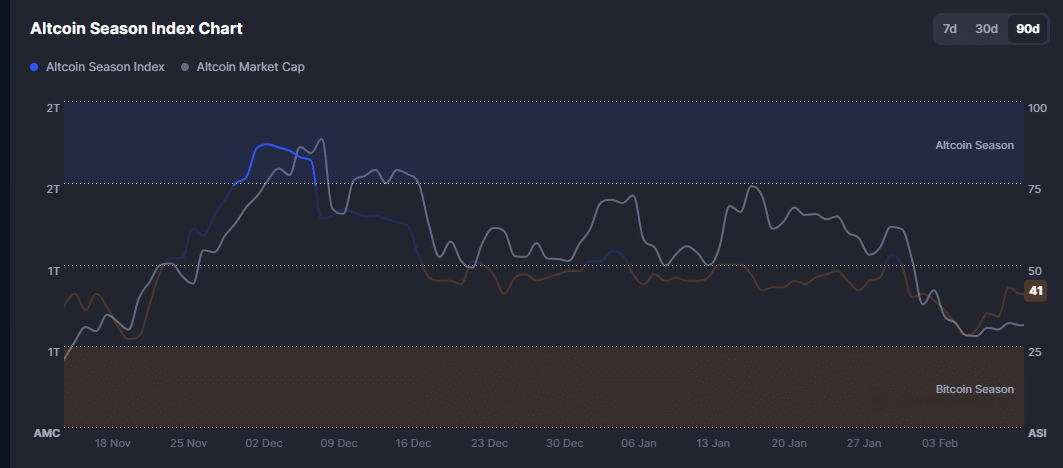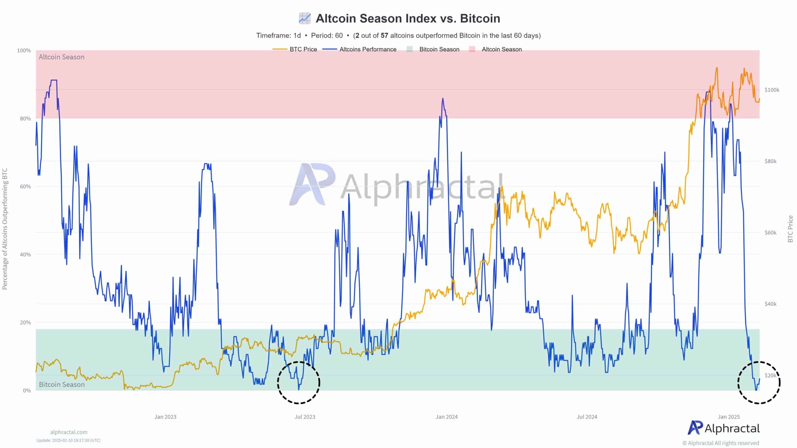 For perspective, most altcoins shed 20%-90% since late January, with several gems erasing their November ‘Trump pump’ gains. The bleed-out has since dragged the altcoin season index into a pivotal area relative to BTC.