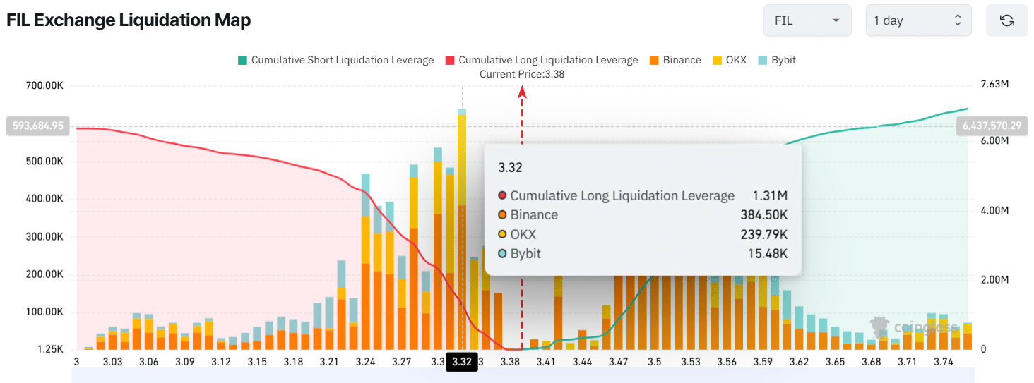 Data showed that intraday traders holding long positions were over-leveraged at the $3.32 level, totaling $1.31 million in long positions. Meanwhile, traders betting on short positions were over-leveraged at $3.42, holding $268,620 in short positions.