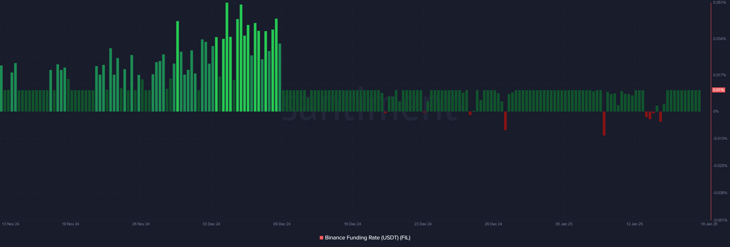 Binance funding rates for FIL were slightly positive at 0.01%, reflecting cautious optimism in the market. While this indicated that traders have been marginally more bullish than bearish, the absence of significant funding rate spikes also hinted at a lack of conviction.